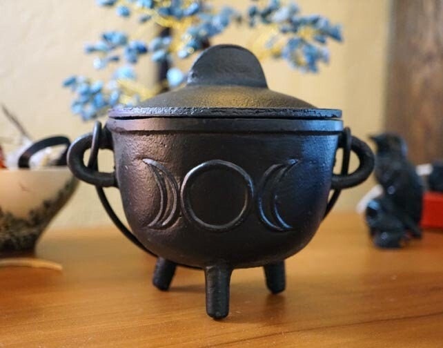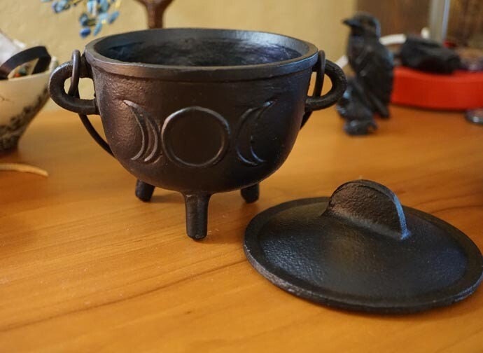 A solid black cast iron cauldron bearing the raised image of a Triple Moon