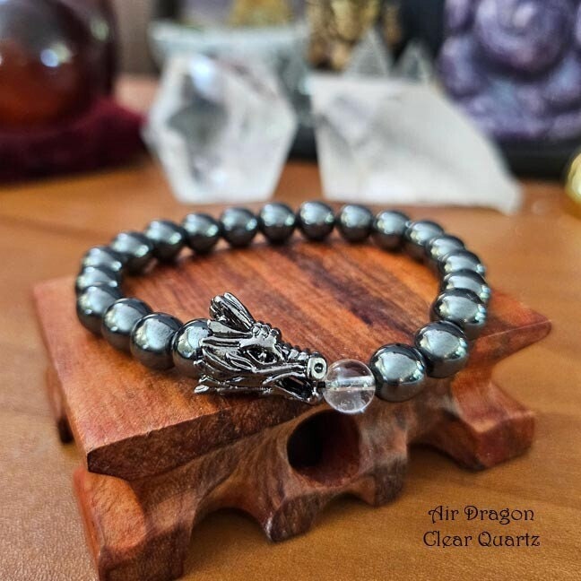 These bracelets are made with 8mm hematite beads, a dragon head and one 6mm bead, in each element: