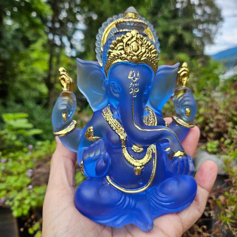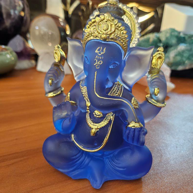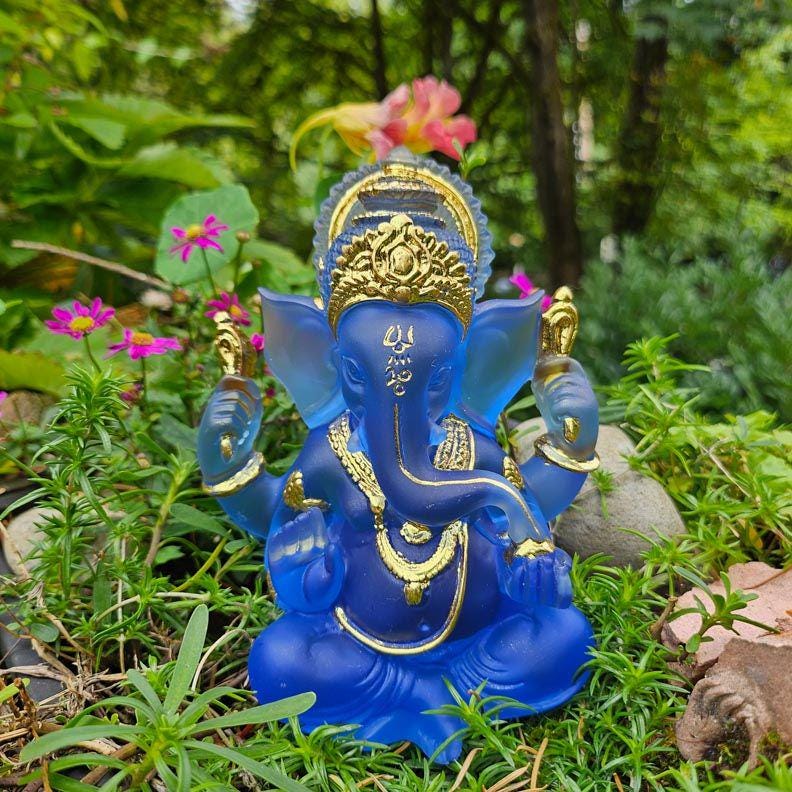 Invite divine guidance and graceful beginnings with this radiant Ganesh figurine, cast in deep blue resin and adorned with hand painted gold accents and sacred symbols. Standing 6" tall and 4" wide, this piece is perfect for altars, sacred spaces, or as a meaningful gift.