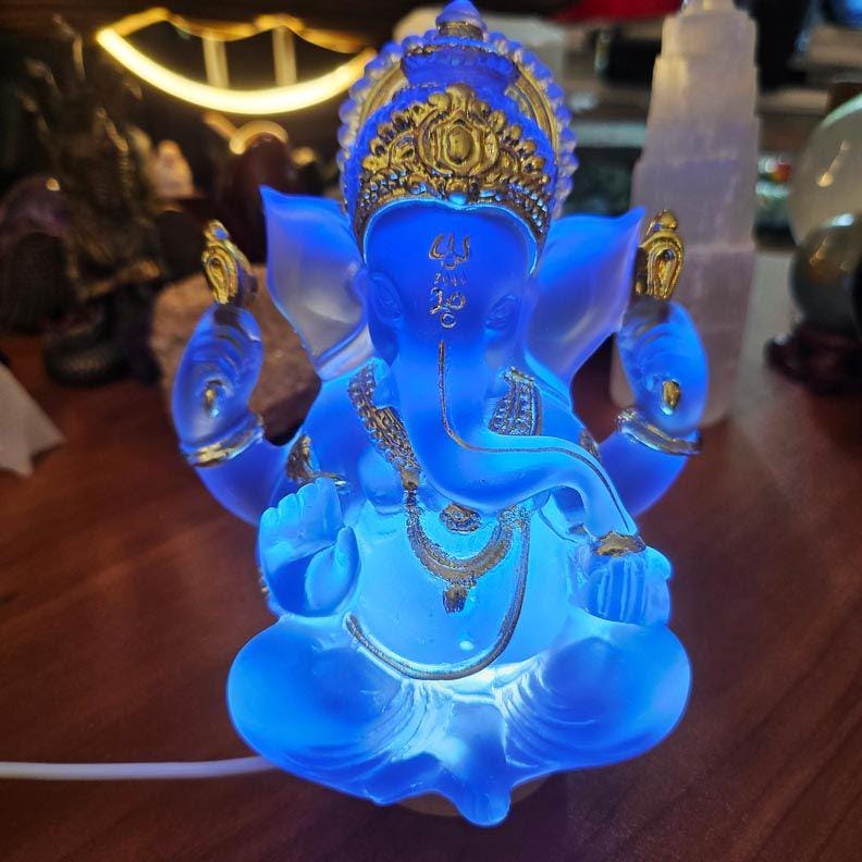 ✨ Place it atop a crystal LED light to awaken its full radiance—watch as the blue resin glows like celestial waters and the gold accents shimmer like divine fire. The illumination transforms this sacred sculpture into a beacon of blessing and beauty.