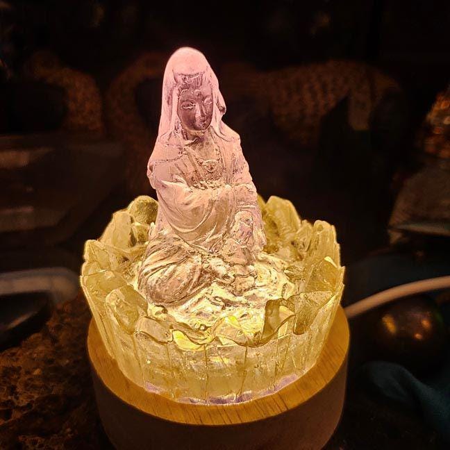 A resin figure of Kuan Yin rests gracefully atop a 2" LED USB light, softly illuminated from within. She is encircled by clear quartz points, amplifying her serene energy. The lamp is around 4" tall with small variations.