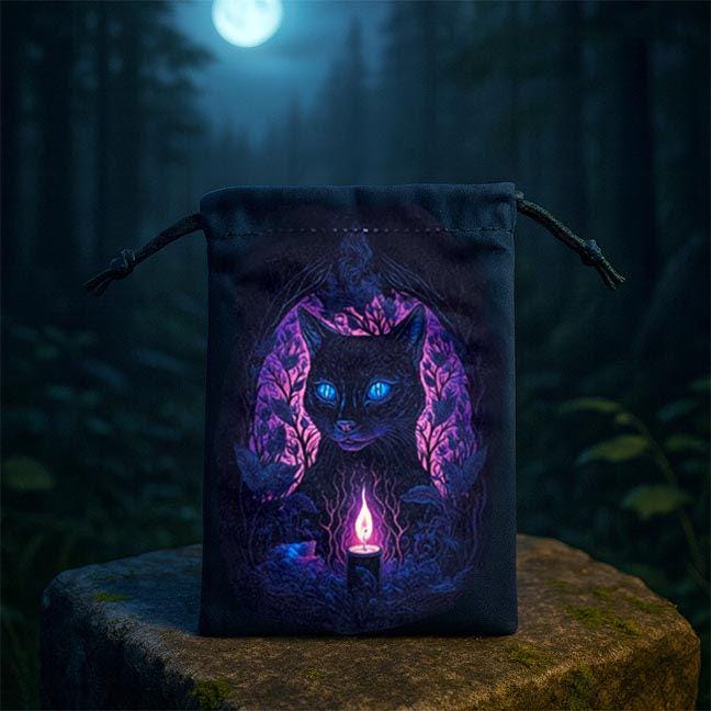 This 5" x 7" drawstring pouch features a striking black cat seated in quiet power, paws gently cradling a glowing purple candle. The artwork radiates intuition, protection, and a spark of spellcraft — perfect for those who walk between worlds.