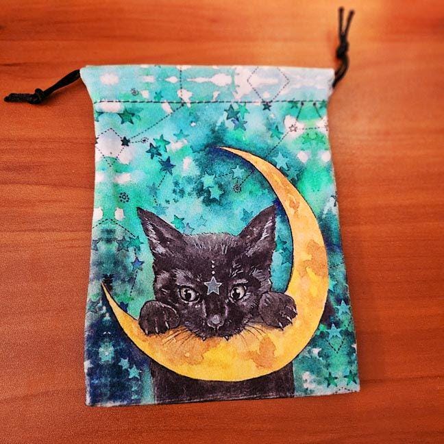 This 5" x 7" drawstring pouch features a striking black cat climbing a crescent moon. The artwork radiates intuition, protection, and a spark of spellcraft — perfect for those who walk between worlds.