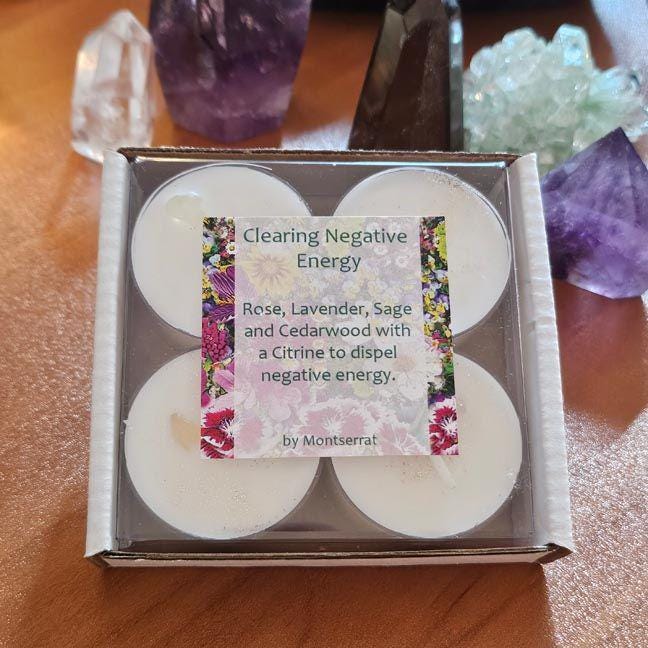 Set of 4 Clearing Negative Energy Soy Tea Lights. Each burns approx 4 hours.